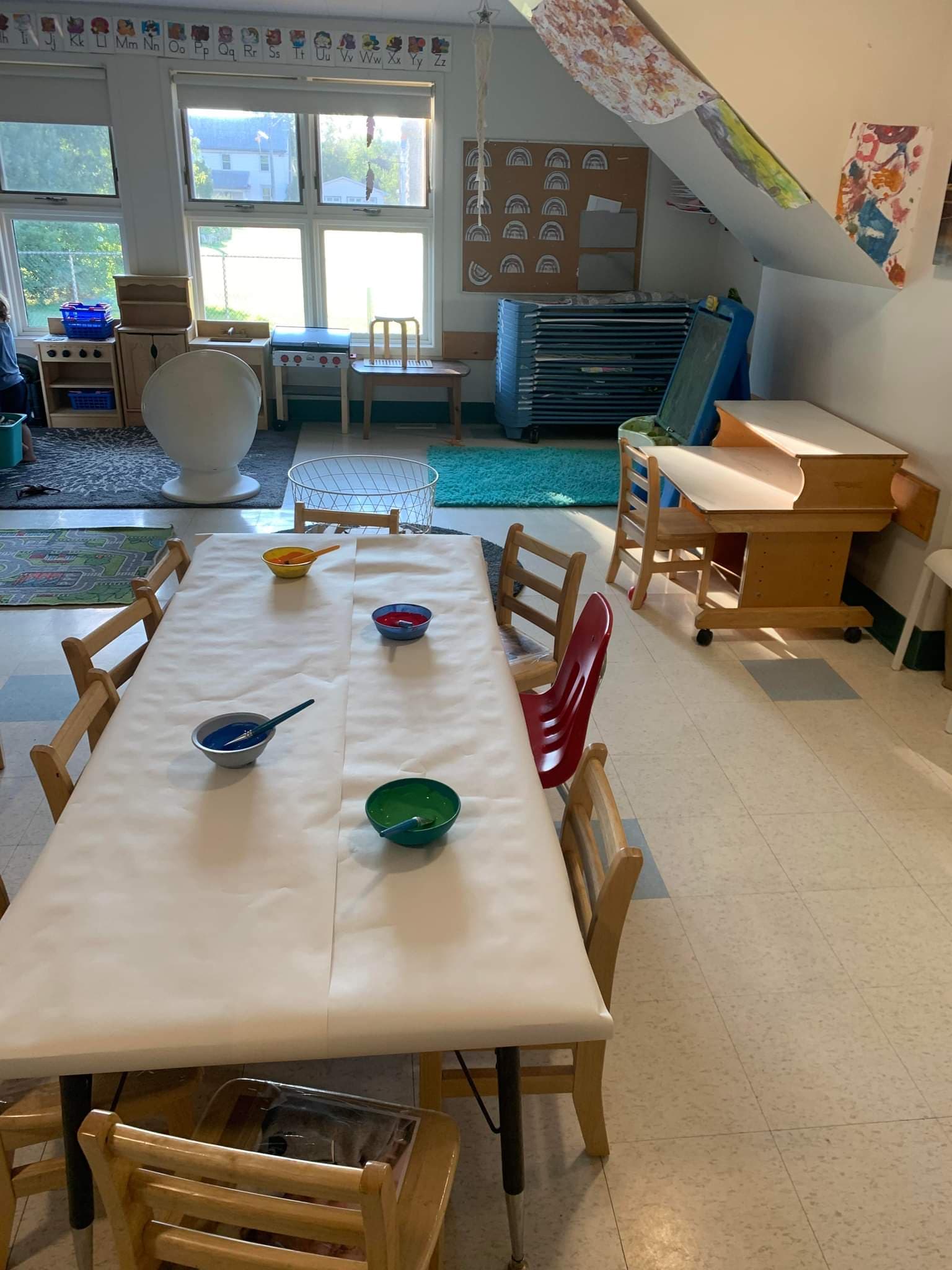Creative Expression: In our preschool programs, there is always a creative center available. The ‘art shelf’ is stocked with paper, pencils, markers, and crayons. In addition to those things, you will often find paint, glue, scissors, tissue paper, chalk, string, popsicle sticks, and lots of other materials to work with. The children are welcome to explore these materials and create their art however they choose.